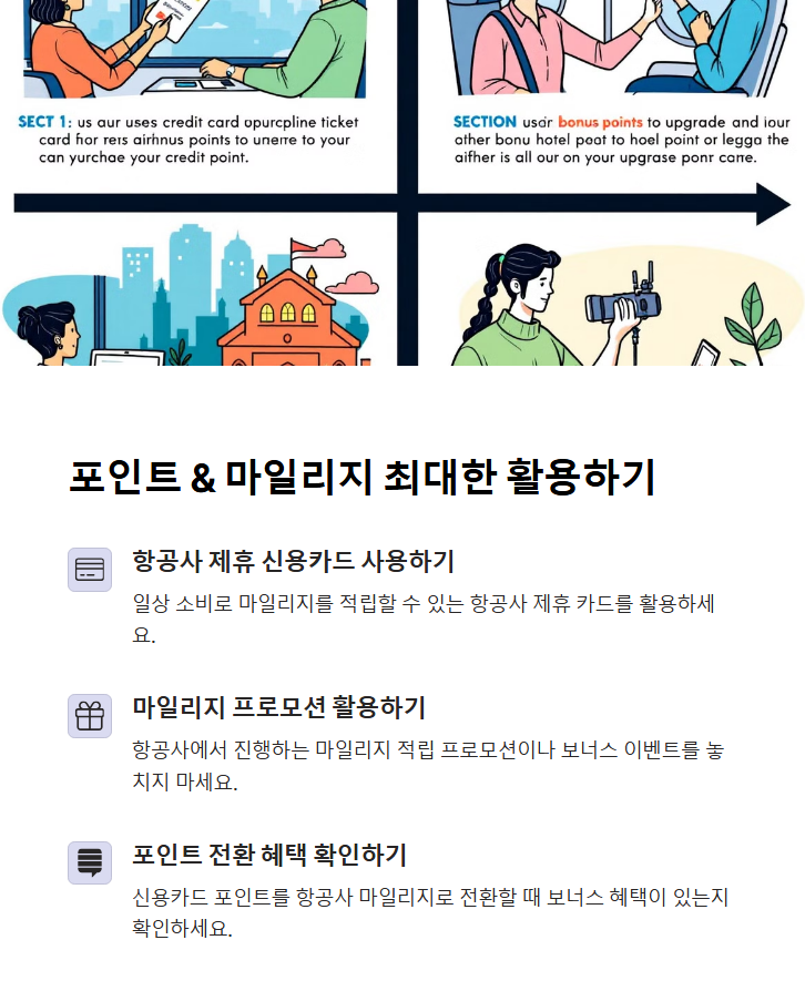 ✅ 마일리지 적립 방법 1. 신용카드 포인트 적립 – 항공사 제휴 신용카드를 이용하면 항공권 구매 시 마일리지를 추가로 받을 수 있어요. 2. 제휴사 이용 – 호텔, 렌터카, 레스토랑에서 마일리지를 적립할 수 있어요. 3. 프로모션 활용 – 항공사마다 특정 시즌에 마일리지 적립 프로모션을 진행해요.