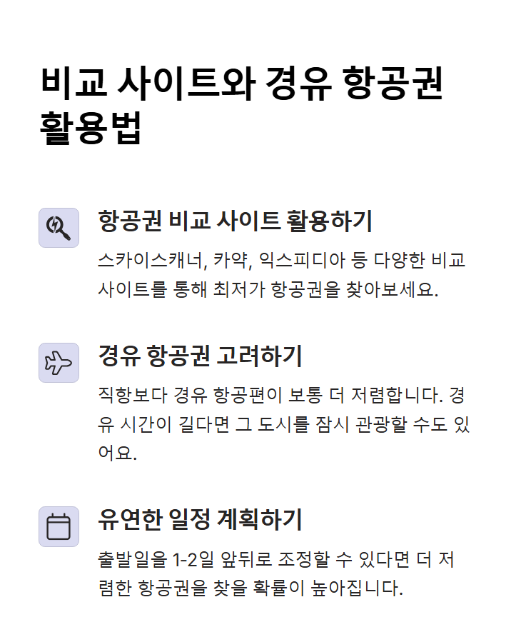 3. 비수기 여행을 고려하기 성수기(여름 방학, 연말연시)에는 가격이 크게 오르지만, 2~4월, 9~11월 같은 비수기에는 훨씬 저렴하게 비행기표를 구할 수 있어요.