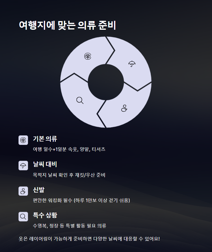 | 기후 맞춤 옷 | 여행지 날씨에 맞춰 준비 |