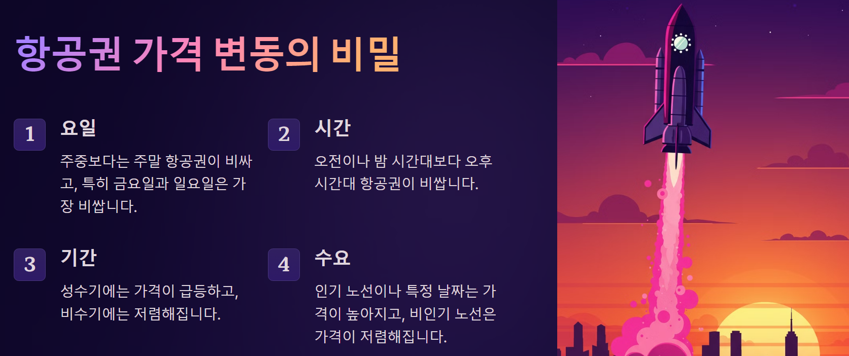 | 수요와 공급 | 좌석이 많이 팔릴수록 가격 상승 |