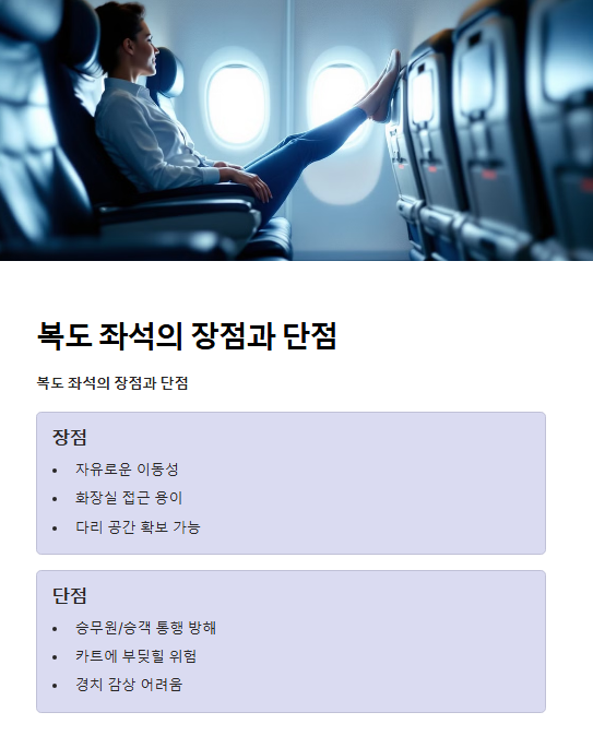 단점은 아무래도 '승객 이동 통로'라는 점이에요. 사람들이 자주 지나가고, 승무원의 카트가 닿을 수도 있어서 수면 중 방해가 될 수 있어요. 창문이 없어 경치를 못 본다는 점도 아쉬움 중 하나죠. 그리고 통로 쪽이라 부딪힘도 자주 발생해요.