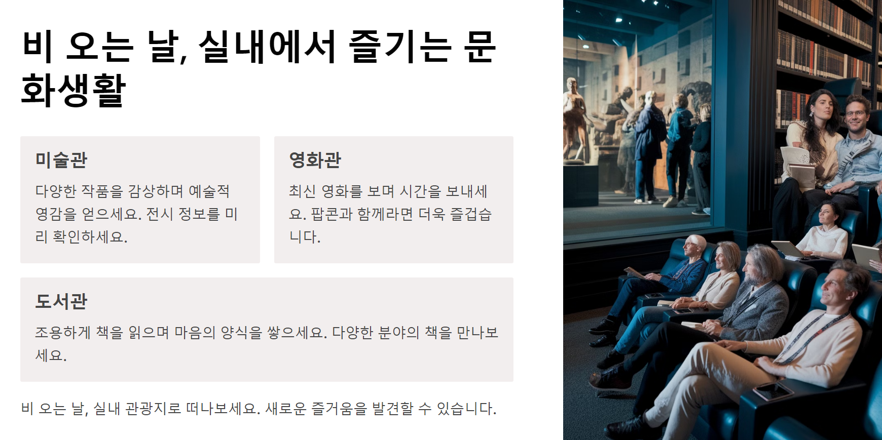 비 오는 날에는 실내에서 즐길 수 있는 관광지를 방문하는 것이 좋아요. 🏛️🎨