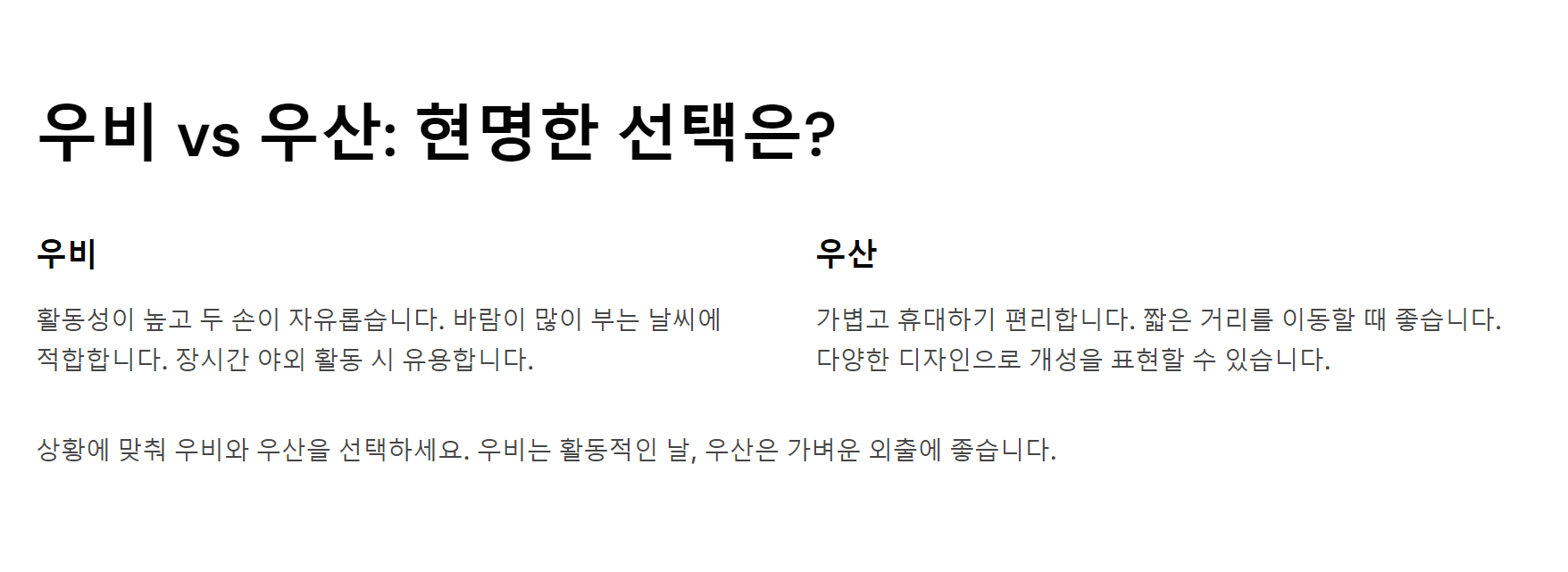 | 우산 | 비를 효과적으로 막아줌 | 바람에 취약, 한 손 사용 불가 | 바람이 적고 가벼운 비 |