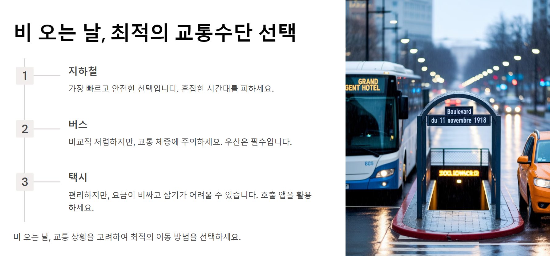✔️ 대중교통 활용: 지하철이나 버스를 이용하면 비를 맞지 않고 이동할 수 있어요.