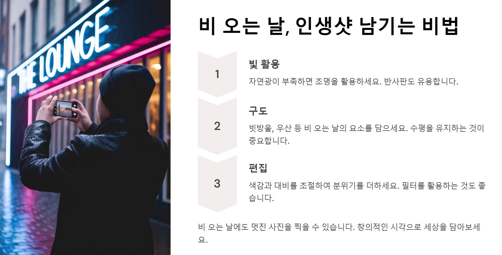 ✔️ 반사 효과 활용: 빗물이 고인 바닥에 반사되는 조명을 이용하면 색다른 분위기의 사진을 찍을 수 있어요.