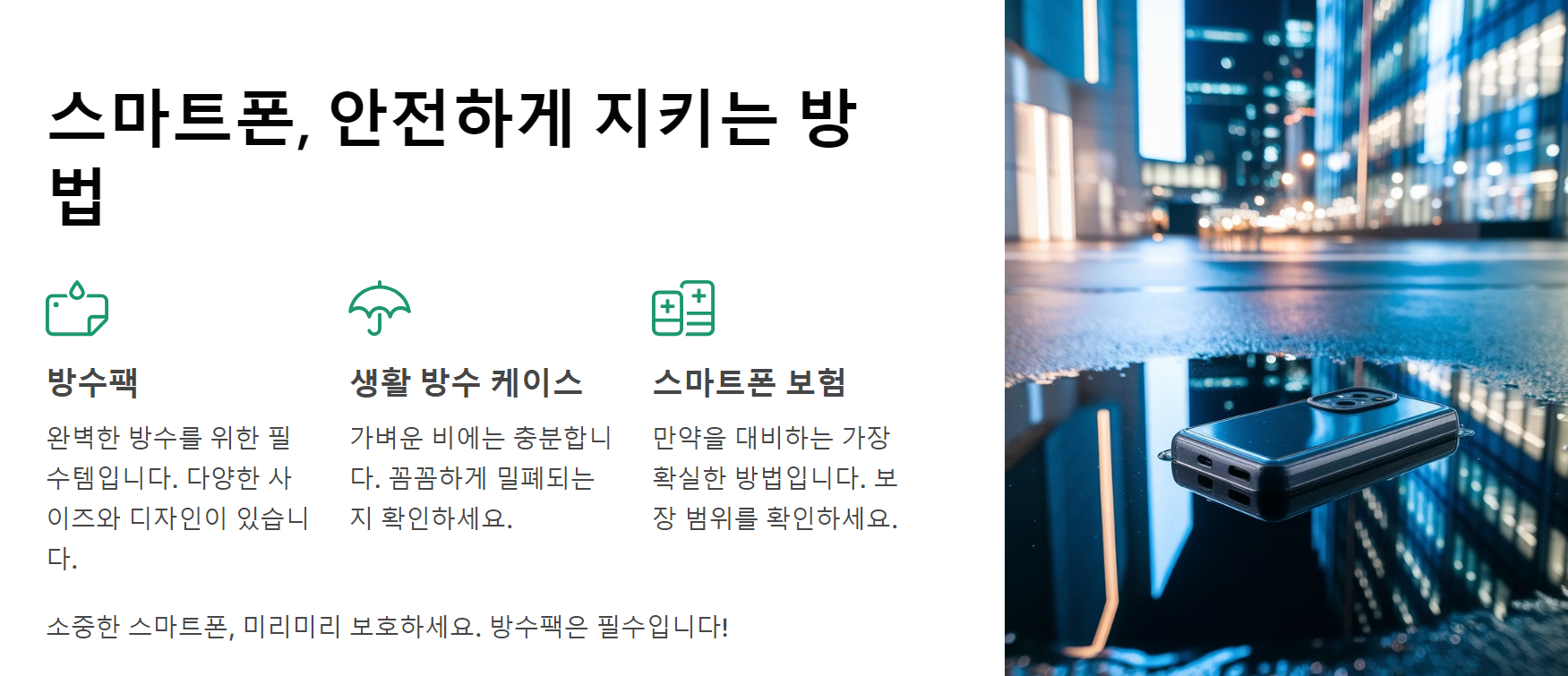 방수팩을 활용하면 비 오는 날에도 스마트폰을 안전하게 사용할 수 있어요! ⛅
