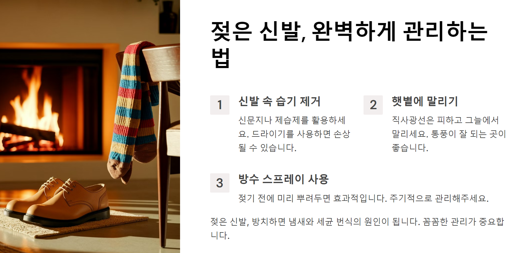 ✔️ 방수 신발: 고어텍스(Gore-Tex) 소재가 포함된 신발을 선택하면 비에 젖지 않고 쾌적함을 유지할 수 있어요.