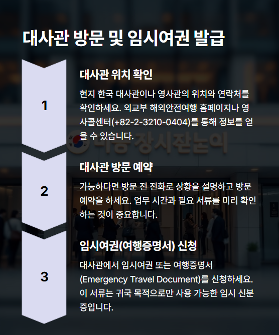 경찰 신고가 끝났다면, 이제 대한민국 대사관 또는 총영사관을 방문해 여권을 대체할 임시여권(여행증명서)을 발급받아야 해요. 이 서류 없이는 귀국 항공기 탑승도 불가능하답니다.