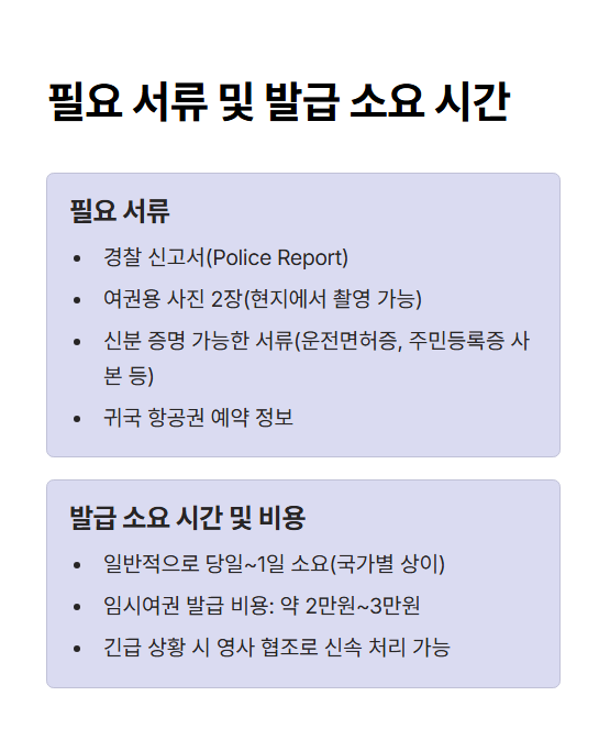 그리고 곧바로 주재국 대한민국 대사관 또는 총영사관을 방문해 임시여권(여행증명서)을 신청해야 해요. 늦어질수록 항공권 변경이나 추가 숙박비 발생 가능성이 커지니까요.