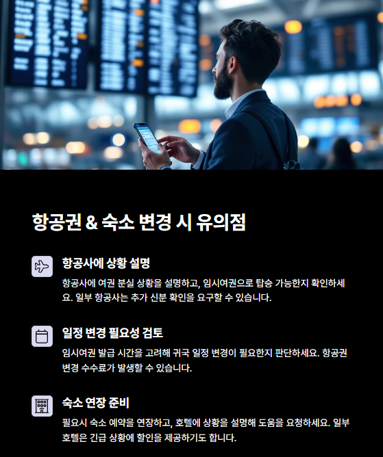 임시여권을 발급받은 후에는 귀국 항공편 일정을 조정해야 할 수도 있어요. 이때 항공사와 숙소 측에 분실 상황을 설명하고 변경 수수료 또는 환불 조건을 확인해야 해요.