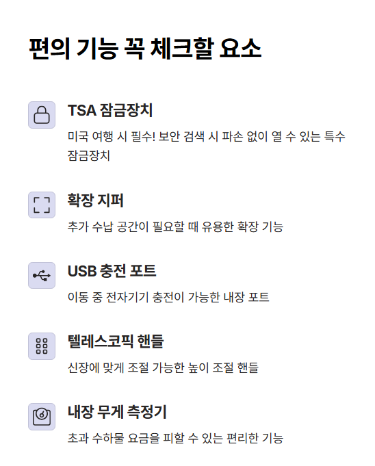 가방 고를 때 ‘크기’와 ‘바퀴’만 보시나요? 그럼 진짜 놓치고 있는 부분이 있어요. 여행 캐리어에는 생각보다 다양한 부가 기능이 있어요. 이것만 챙겨도 여행 편의성이 훨씬 높아진답니다.