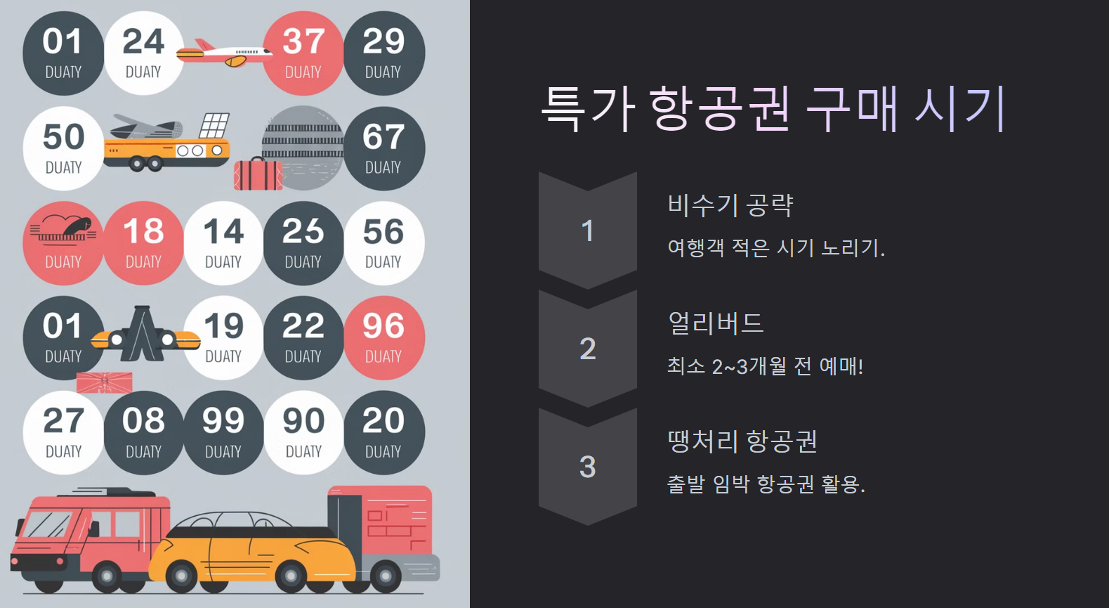 | 화·수요일 | 새벽 시간대 | 항공사 할인 적용 가능 |