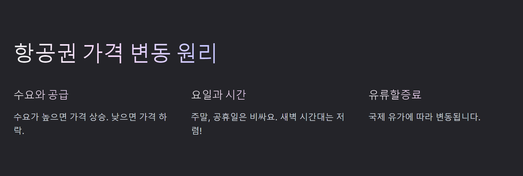 | 국내선 | 1~2개월 전 | 단거리라 변동성이 낮음 |