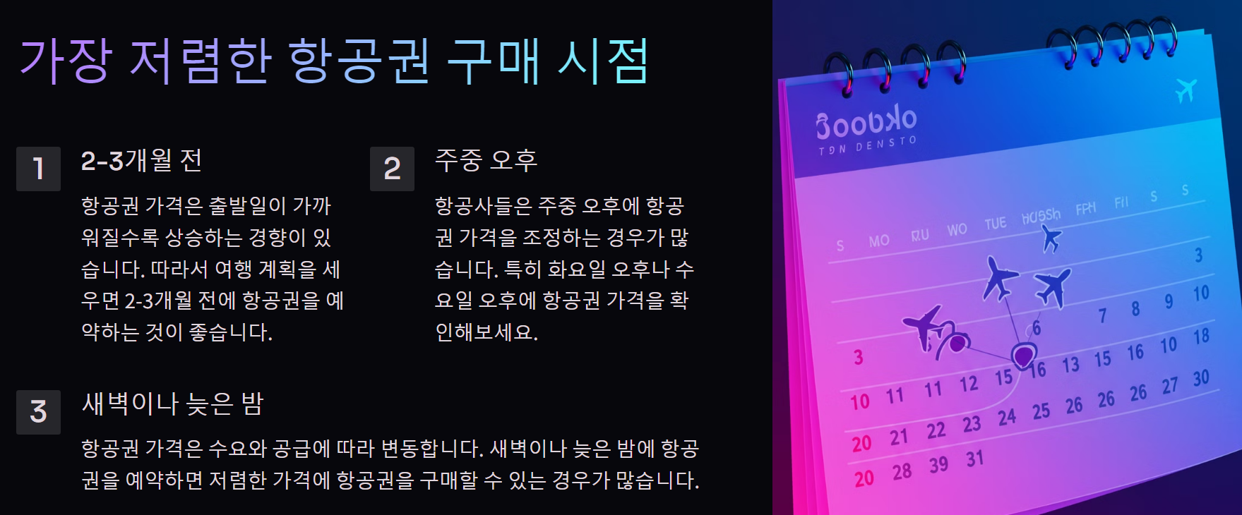 항공권을 저렴하게 구매하려면 ‘언제’ 예매하는지가 중요해요. 같은 목적지라도 예약 시점에 따라 가격 차이가 크답니다. 보통 출발일이 가까울수록 가격이 오르기 때문에 미리 예약하는 것이 좋아요.