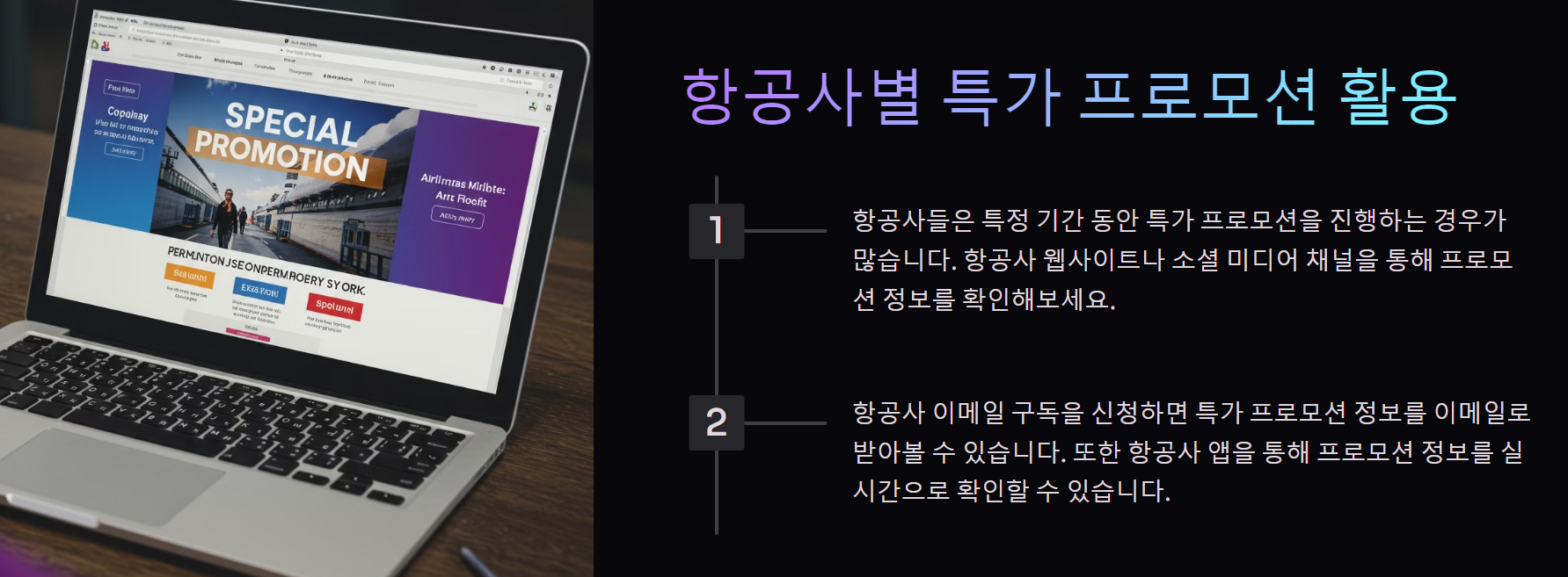 각 항공사에서는 주기적으로 특가 프로모션을 진행해요. 이때를 잘 활용하면 최저가 항공권을 쉽게 구매할 수 있어요.
