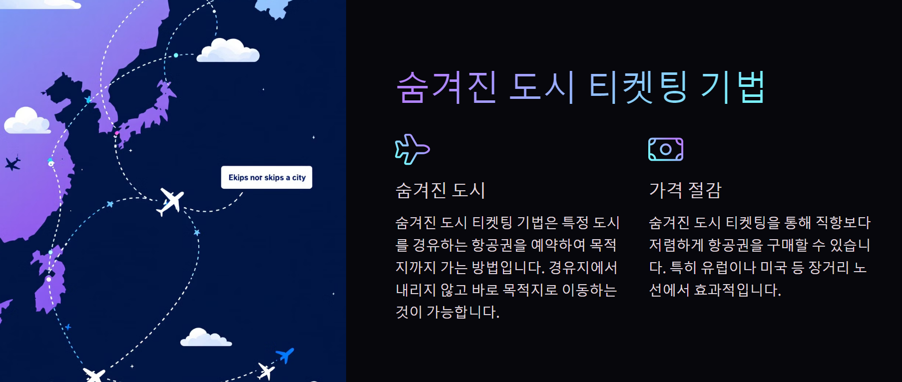 숨겨진 도시 티켓팅(Hidden City Ticketing)은 최저가 항공권을 찾는 비법 중 하나예요. 직항보다 경유 항공권이 저렴할 때, 최종 목적지가 아닌 중간 경유지에서 내리는 방식이에요.