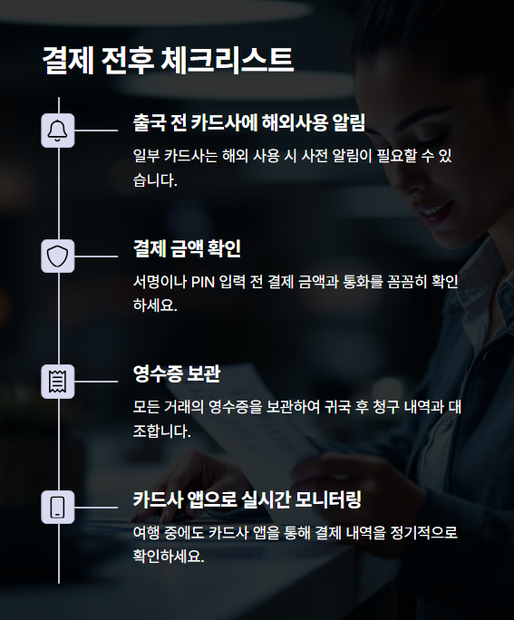 해외에서 카드는 ‘믿고 쓰는 지갑’인 만큼, 조심해서 똑똑하게 사용하세요! 🧾