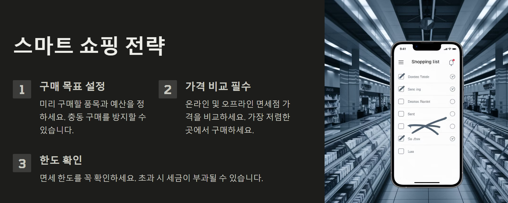 면세점 쇼핑할 때 한도를 넘겨서 추가 세금을 내게 되면 오히려 손해예요. 😢 그래서 면세 한도를 초과하지 않으면서도 알뜰하게 쇼핑하는 방법을 알아두는 게 중요해요.