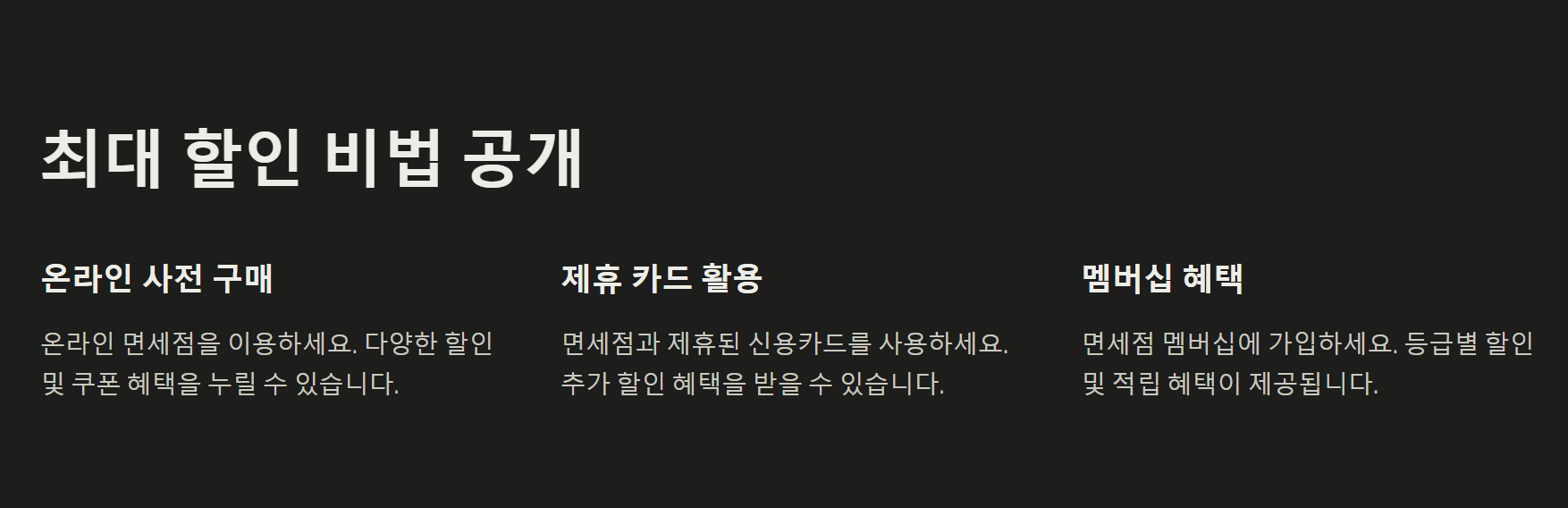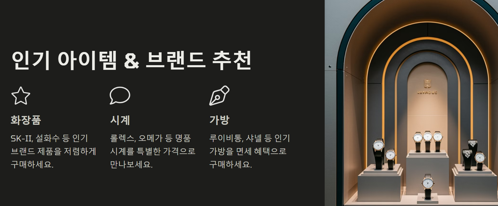 | 면세점 멤버십 | 가입 즉시 할인 쿠폰 제공, VIP 등급 승급 시 추가 할인 가능 |