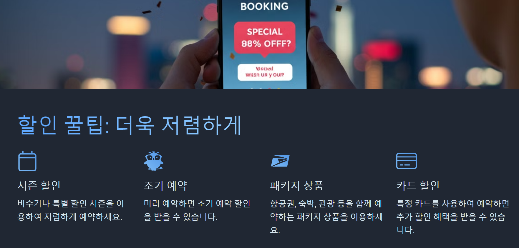 2. 신용카드 혜택 체크: 일부 신용카드는 특정 여행 사이트에서 결제할 때 추가 할인을 제공해요. 카드 혜택을 확인하는 것도 좋아요.