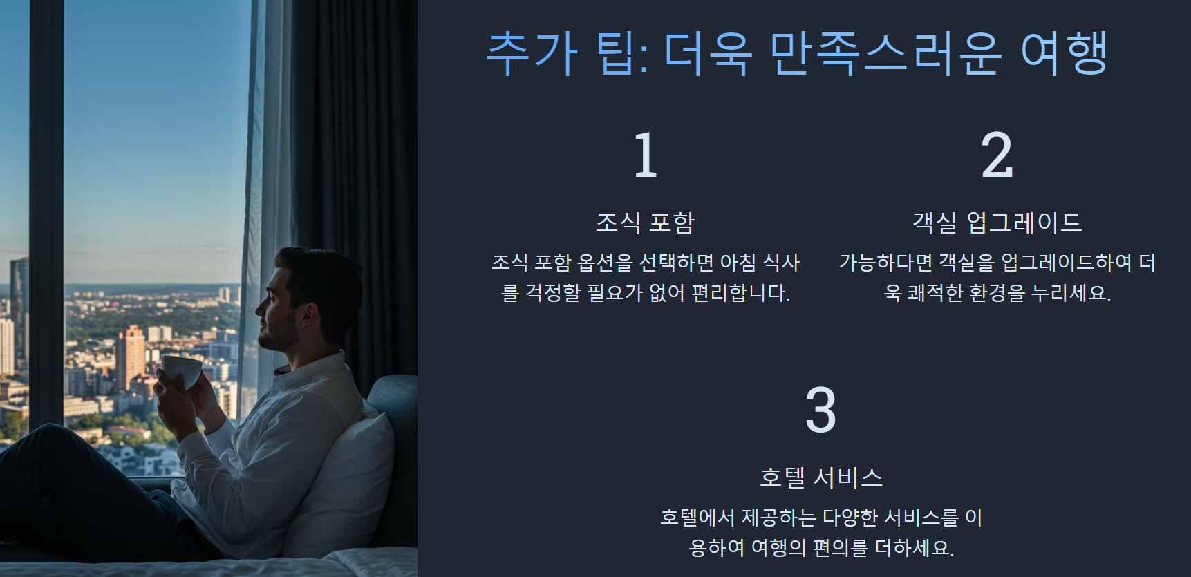 2. 시설 및 편의성: 조식 포함 여부, 무료 와이파이, 수영장, 피트니스 센터 같은 부대시설도 중요한 고려 요소예요.