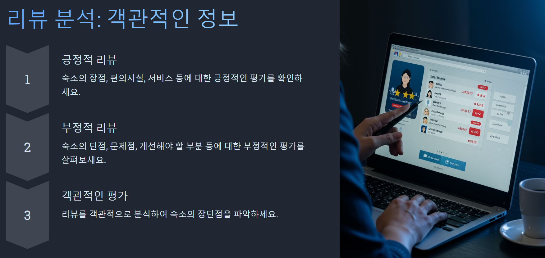 숙소를 예약할 때 리뷰를 꼼꼼하게 읽는 것이 중요해요. 다음과 같은 부분을 체크하면 좋아요.