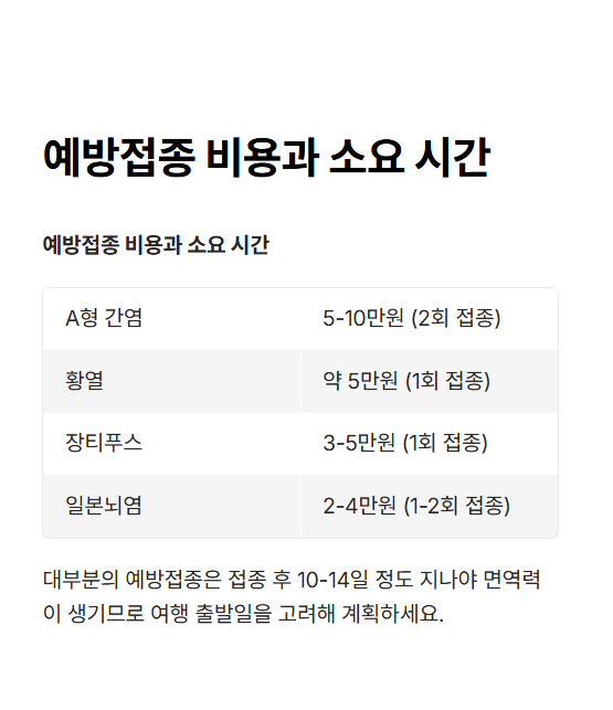 | 동남아(태국, 베트남 등) | A형 간염, 장티푸스, 파상풍 | 수인성 감염 예방 |