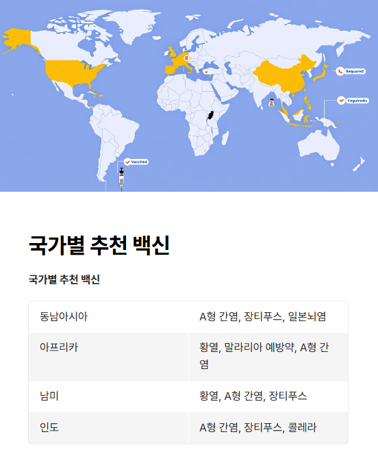 | 아프리카 | 황열, 말라리아 예방약, A형 간염 | 황열 백신 필수 국가 다수 |
