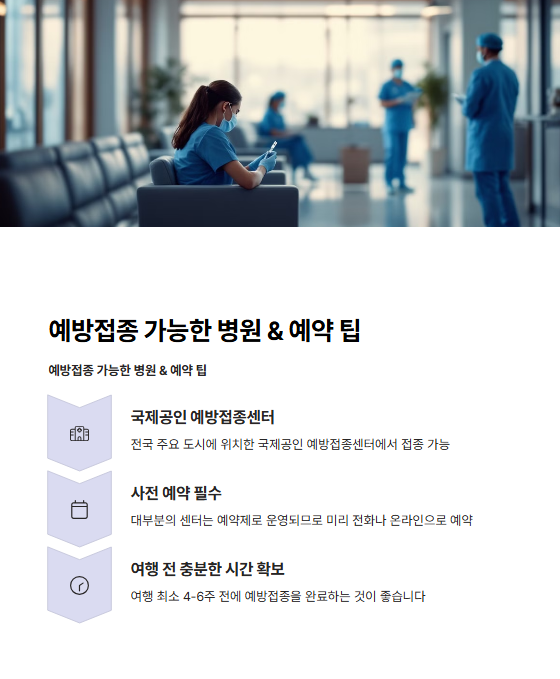 해외여행 관련 예방접종은 모든 병원에서 가능한 건 아니에요. 특히 황열 백신은 지정된 병원과 검역소에서만 접종할 수 있어요. 대부분의 예방접종은 보건소나 감염내과 전문병원에서 가능해요.