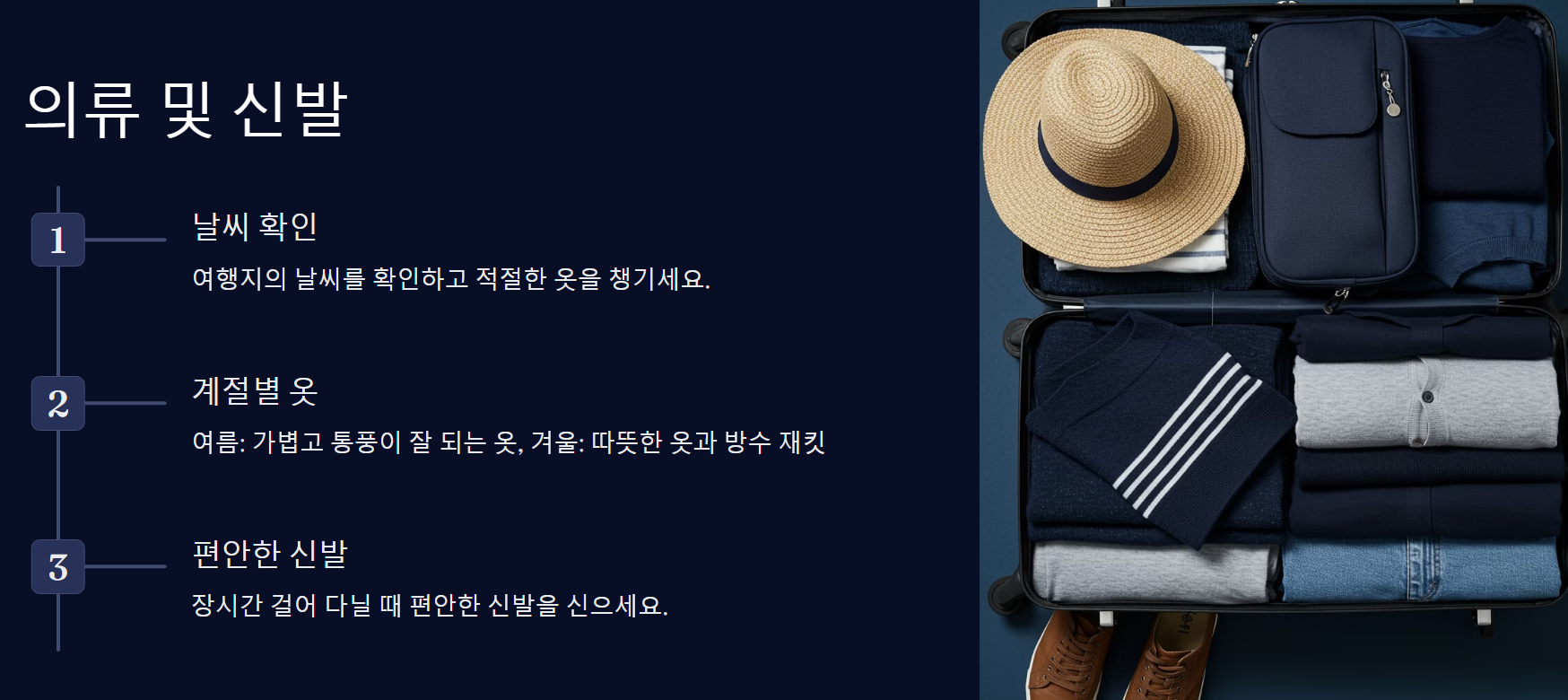 여행지의 날씨와 일정에 따라 적절한 의류를 준비하는 것이 중요해요. 기온 차이가 큰 지역이라면 얇은 옷을 여러 겹 레이어드할 수 있도록 챙기는 것이 좋아요. 한여름이라도 실내 에어컨이 강한 곳이 많기 때문에 가벼운 외투나 가디건을 준비하는 것도 잊지 말아야 해요.