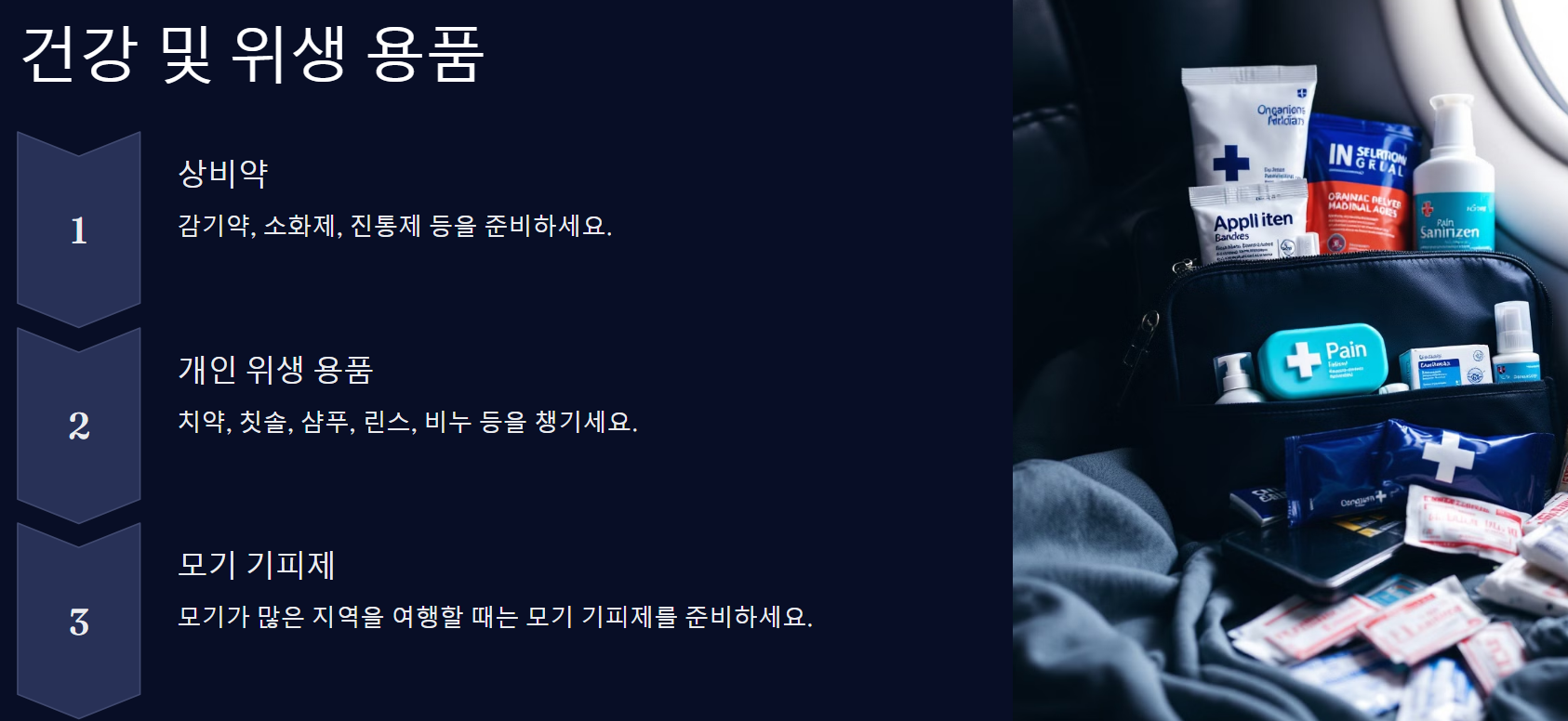 해외에서 갑자기 몸이 아프거나 위생 문제가 발생하면 큰 불편을 겪을 수 있어요. 여행 전에 건강 및 위생 용품을 미리 준비하면 걱정 없이 여행을 즐길 수 있어요.