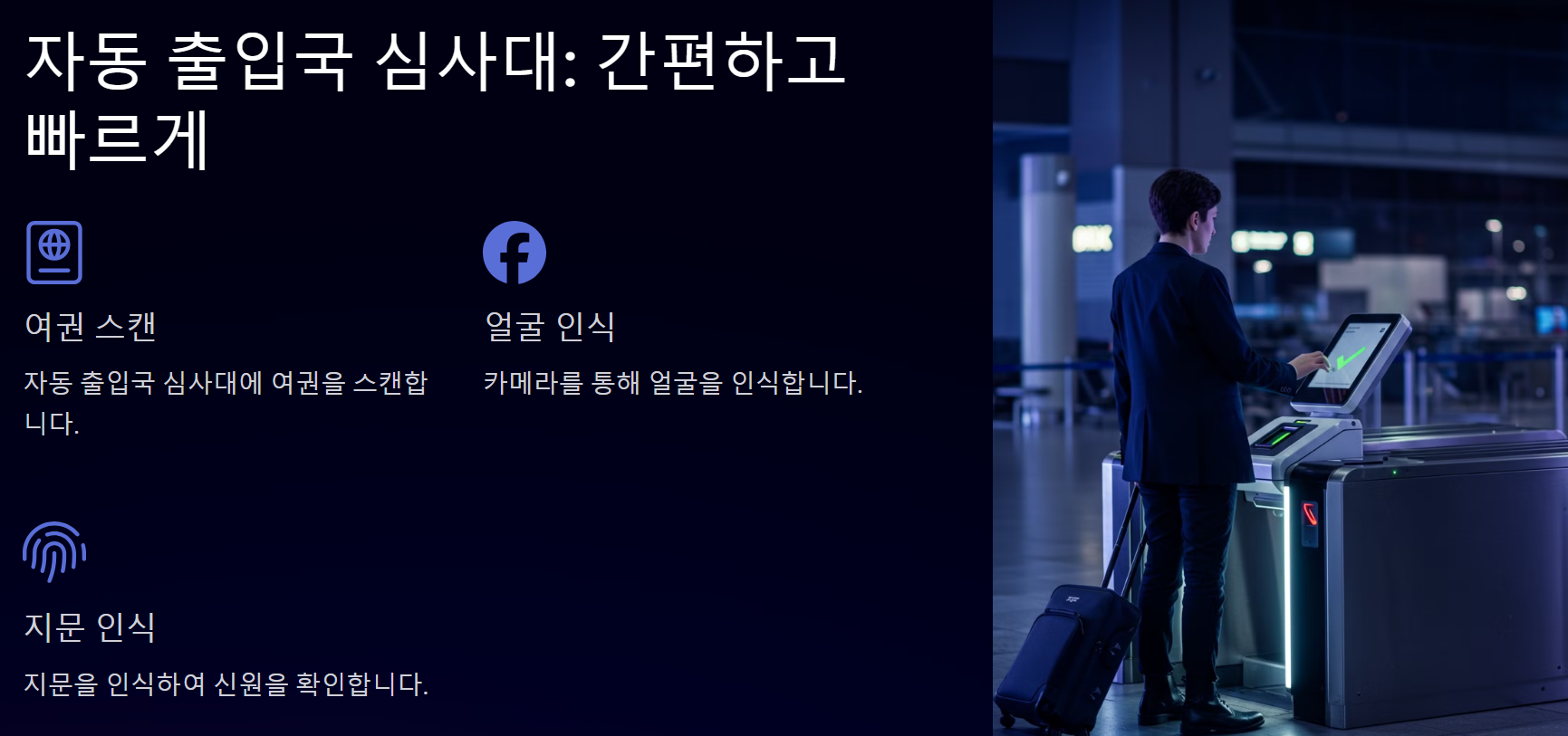 공항에서 빠르게 입국 심사를 마치려면 자동 출입국 심사대(e-Gate)를 이용하는 것이 좋아요. e-Gate는 사람이 직접 심사하는 것이 아니라 기계가 여권과 생체 정보를 확인하는 시스템이에요.