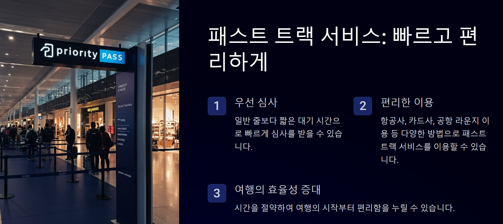 1. 공항별 패스트 트랙: 일부 공항에서는 비즈니스 클래스 승객이나 VIP 고객에게 패스트 트랙을 제공해요.