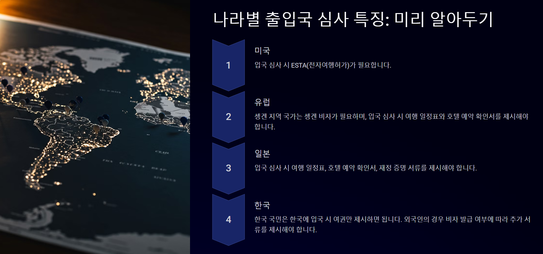 다음은 주요 국가별 출입국 심사 특징이에요: