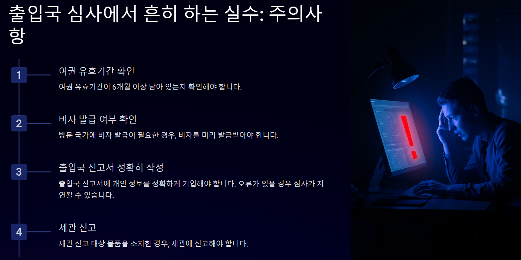 다음은 출입국 심사에서 가장 흔히 하는 실수들이에요: