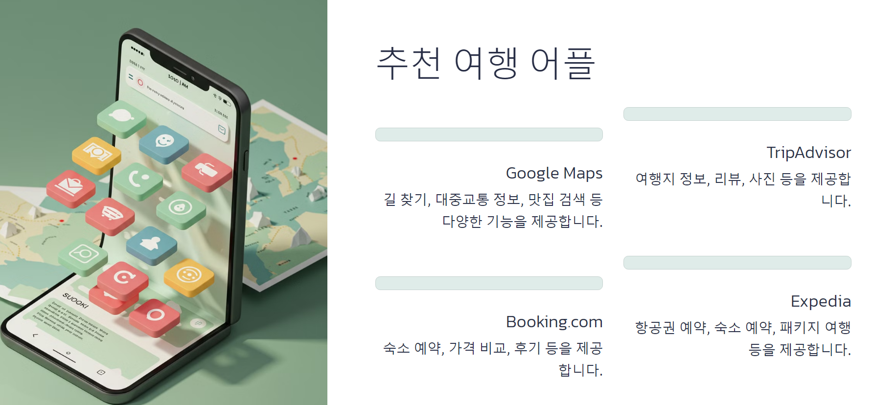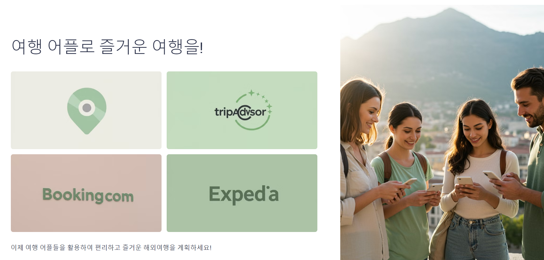 | 구글 트래블 | AI 추천, 항공·호텔 예약 | 구글 계정과 자동 연동 | 일부 지역에서는 데이터 부족 |