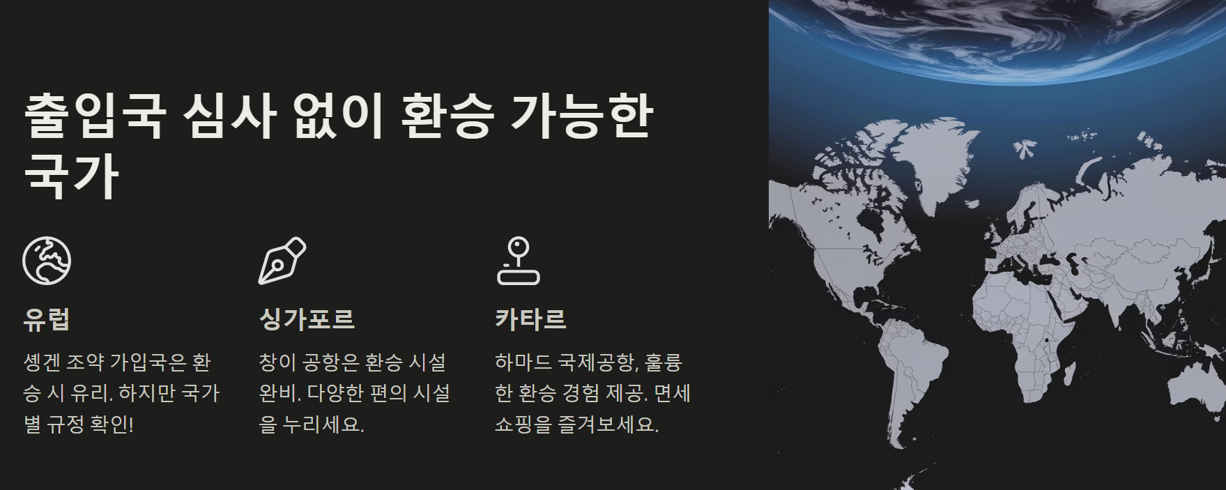 특히 아시아와 유럽의 주요 허브 공항은 환승객을 위한 별도의 통로와 시설을 제공하고 있어요. 다음은 환승 시 출입국 심사가 필요 없는 대표적인 국가들이에요.