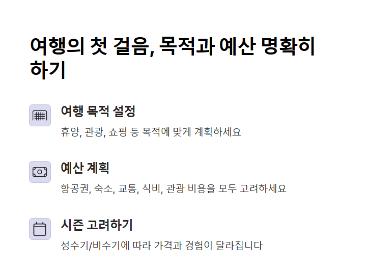 1️⃣ 여행 목적: 관광, 휴양, 액티비티 등 목적을 명확히 하면 경비와 일정을 쉽게 계획할 수 있어요.