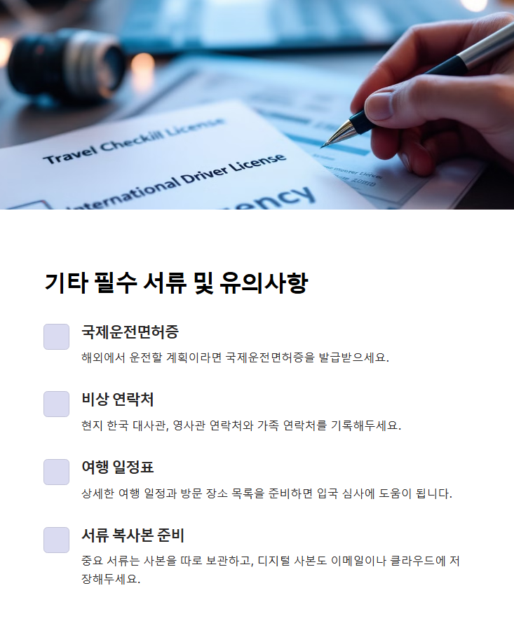 위에서 언급한 필수 서류 외에도 다음과 같은 문서들을 챙기면 여행이 더 안전하고 편리해요.