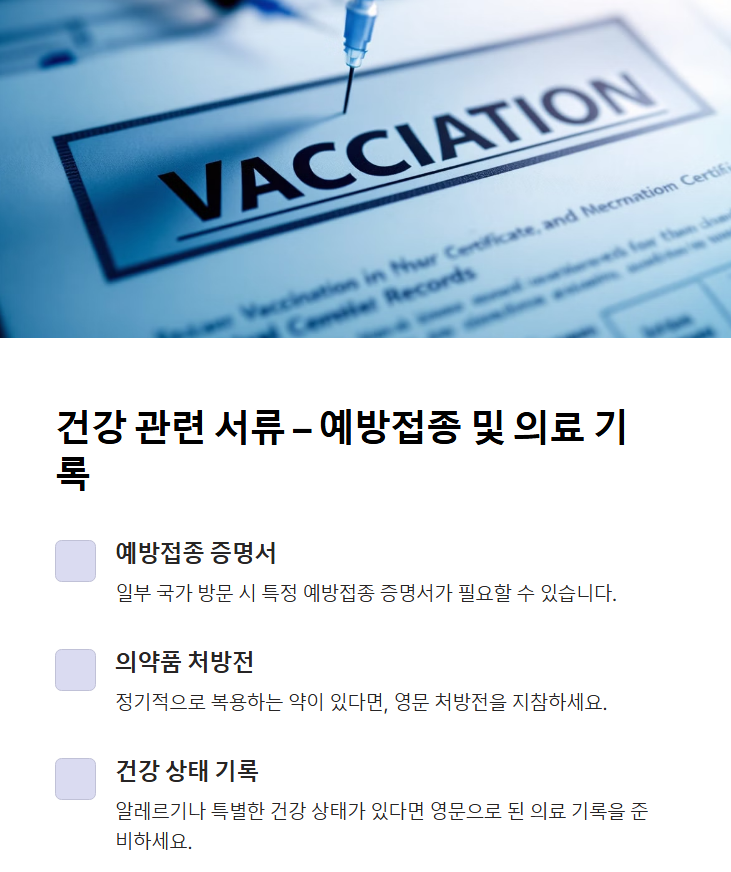 환전과 카드 준비가 끝났다면, 건강 관련 서류도 잊지 말고 챙겨야 해요! 🏥
