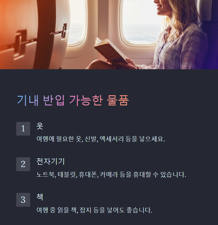 기내 반입이 허용되는 물품은 승객이 직접 소지하고 비행기 안으로 들고 갈 수 있는 물건이에요. 하지만, 일부 물품은 특정 조건을 충족해야만 반입이 가능하니 주의하세요! ✈️🎒