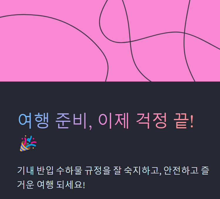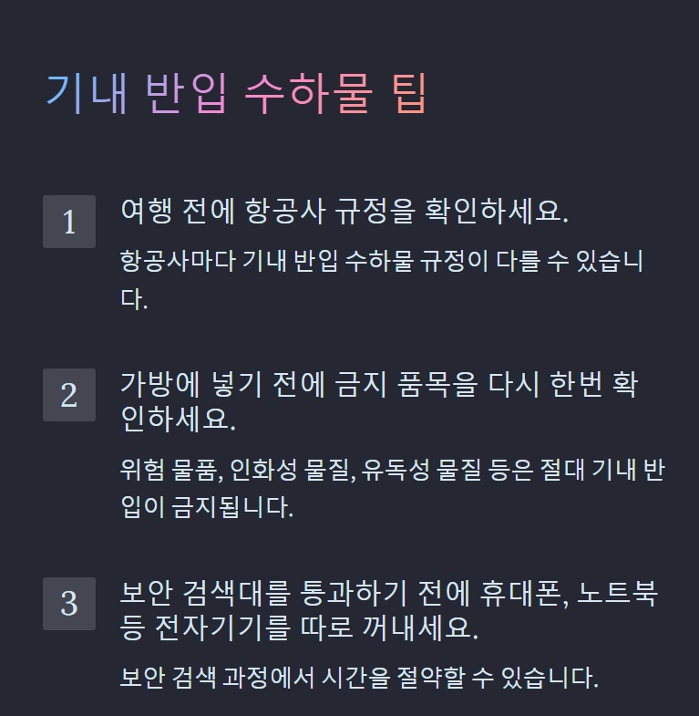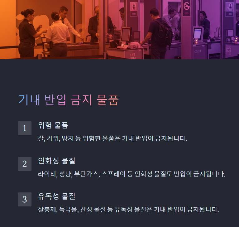 - 🔪 칼, 가위 등 날카로운 물건은 절대 반입 불가 (위탁 수하물로 보내야 함)