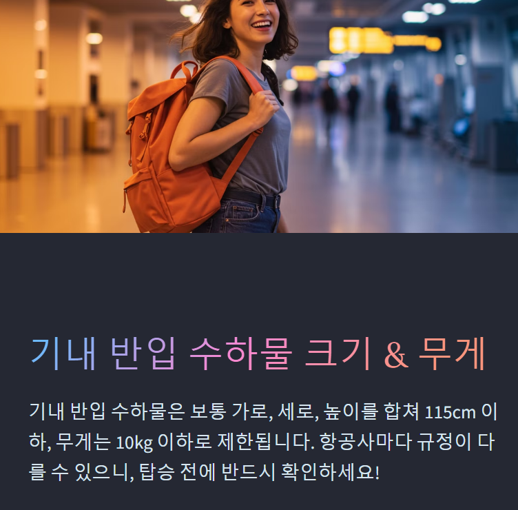 - ✈️ LCC(저가항공)에서는 기내 반입 무게 제한이 더 엄격 (대부분 7kg)