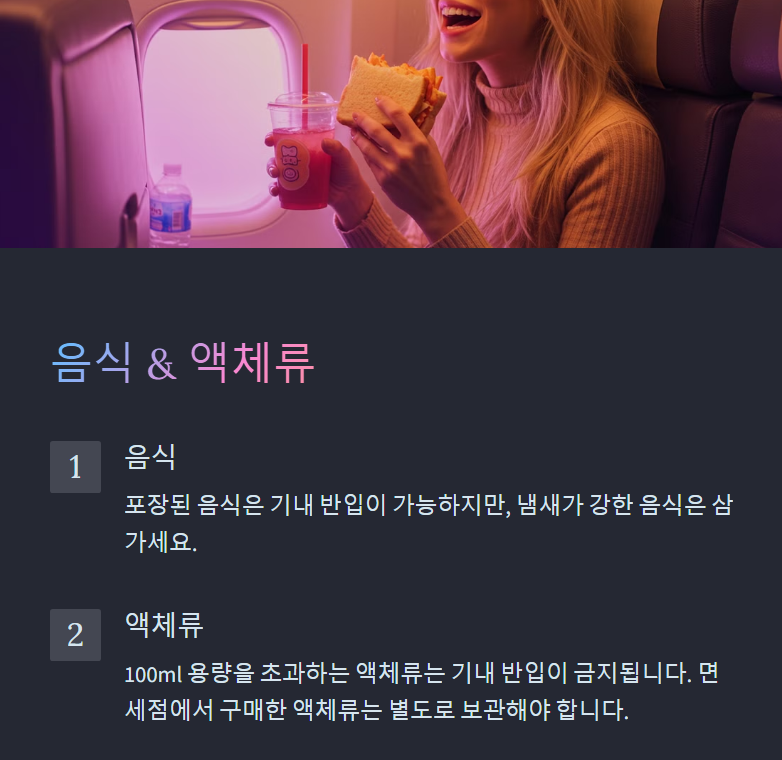 - 🛑 100ml 초과 액체류는 기내 반입 불가! → 물, 음료, 스프, 요거트 등