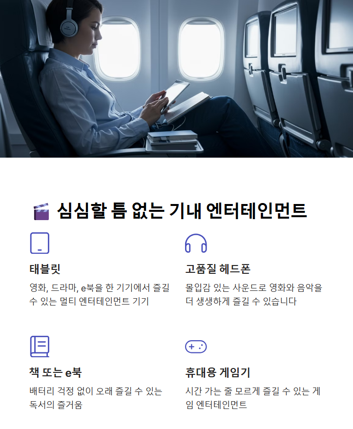 | 📱 태블릿 or 전자책 리더기 | 영화 & 독서로 비행시간을 즐겁게 보내기! |