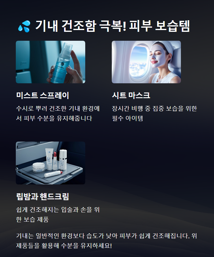 "비행기 타고 나면 피부가 푸석푸석하고 건조해져요!" 😭 기내 습도는 사막보다 낮은 10~20% 수준! 피부 보습을 지키는 필수템과 관리 꿀팁을 알려드릴게요. ✅
