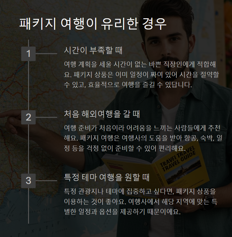 - 📅 여행 일정이 확정되어 있고 변경할 가능성이 낮을 때 → 패키지는 일정 변경이 어렵기 때문에 확정된 계획이 있을 때 유리.