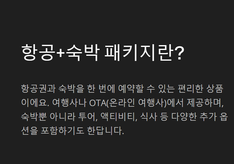 🏨 항공+숙박 패키지란 항공권과 호텔을 한 번에 예약하는 상품을 말해요. 보통 여행사나 OTA(온라인 여행사)에서 제공하며, 별도로 예약하는 것보다 할인된 가격을 제공하는 경우가 많아요. ✈️