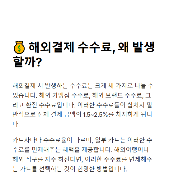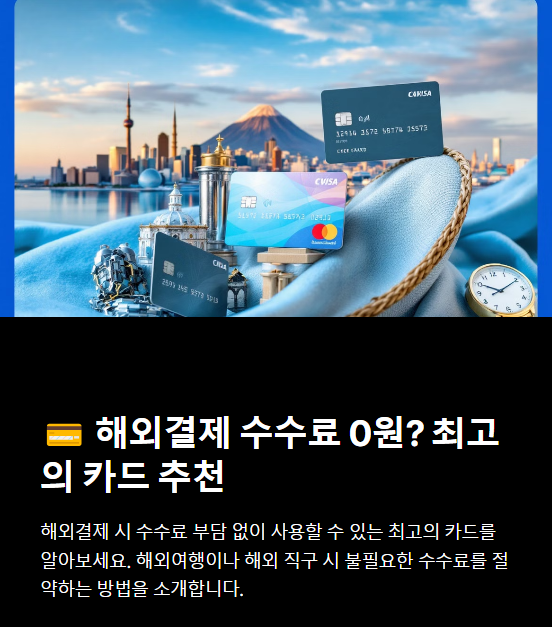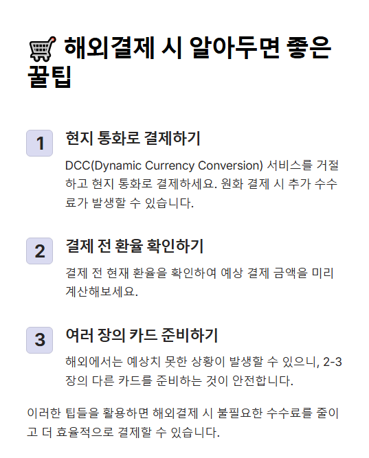 | 💳 해외결제 수수료 0% 카드 사용 | 수수료 없는 카드만 사용하면 추가 비용 절약 가능 |