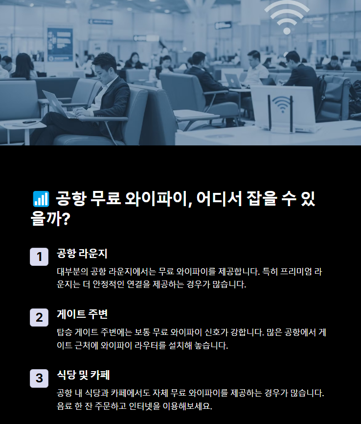 | 🔍 공항 공식 와이파이 확인 | 가짜 와이파이(Fake WiFi)에 속지 않도록 주의! |